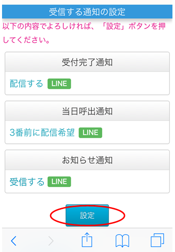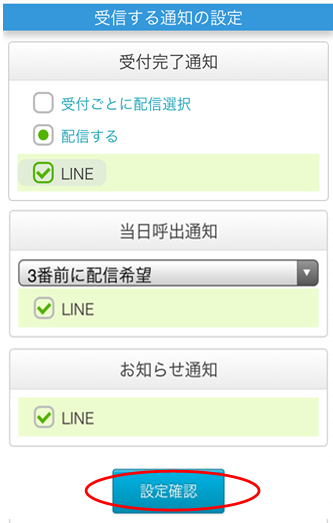 2.受付完了通知、当日呼出通知、お知らせ通知の設定を確認又は変更し、「設定確認」をクリックします。